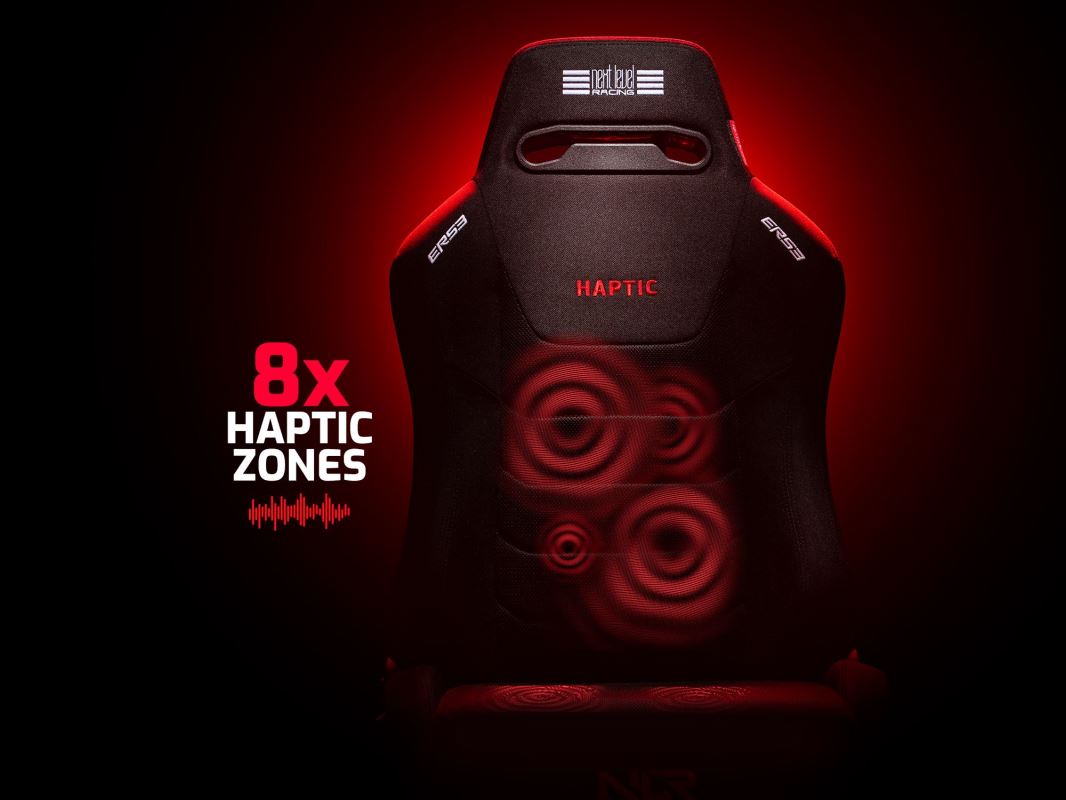 Osm zabudovaných haptických motorů je plně integrováno do rámu sedadla a převádí každou zatáčku, texturu povrchu a náraz do detailního pocitu v reálném čase, přičemž poskytuje přímou a rovnoměrně rozloženou zpětnou vazbu.