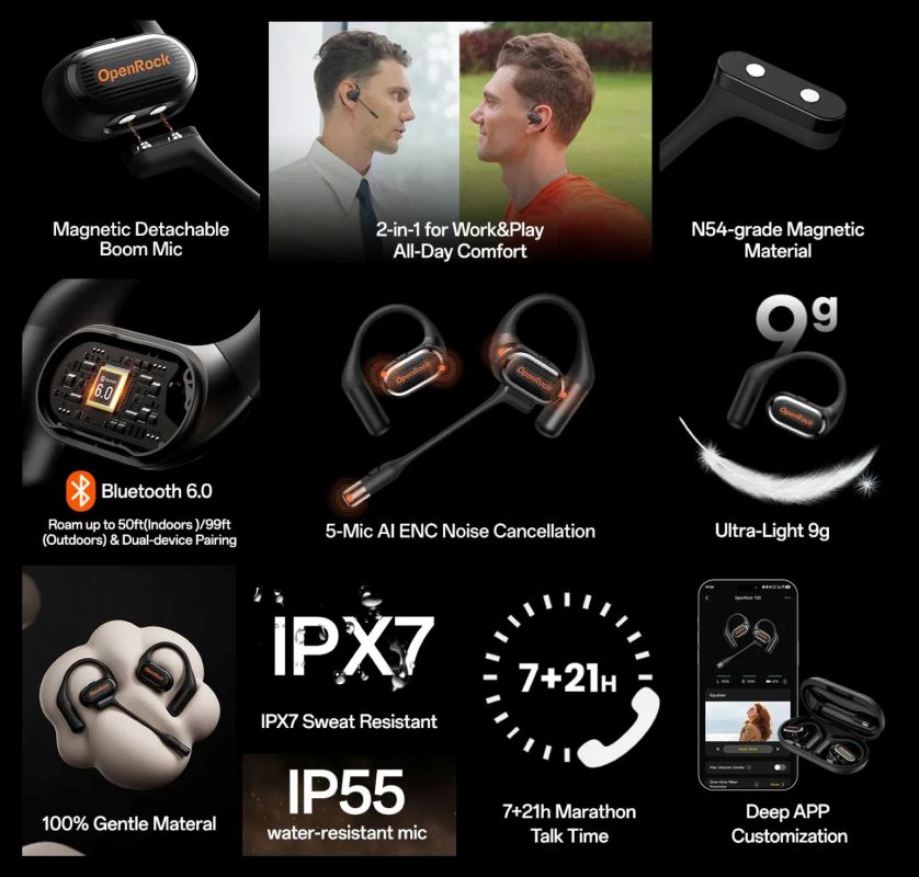 Bluetooth 6.0 poskytuje stabilní připojení s dosahem až 30 metrů a podporou kodeků AAC a SBC, zatímco aplikace OpenRock App umožňuje individuální přizpůsobení zvuku, ovládání a ekvalizéru. S výdrží až 13 hodin přehrávání (nebo 52 hodin s nabíjecím pouzdrem) se stávají ideálním řešením pro dlouhé pracovní dny či herní maratony.