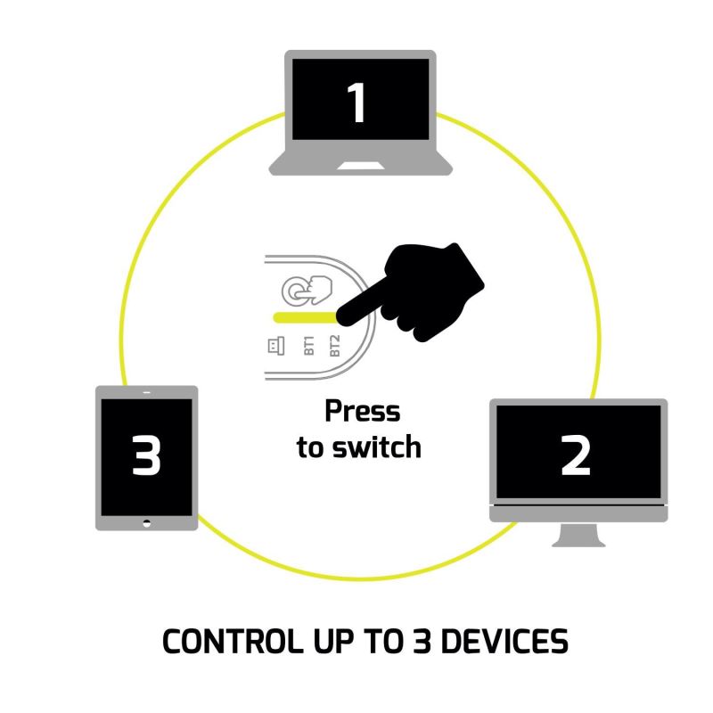 Tato myš umožňuje připojení až ke třem zařízením současně – jednomu přes 2,4GHz bezdrátový přijímač a dvěma prostřednictvím Bluetooth®.