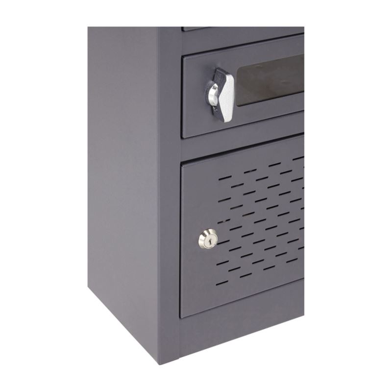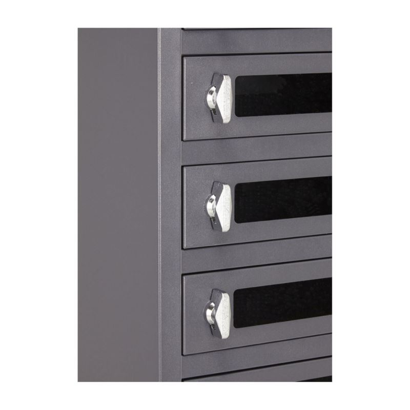 Přístup k jednotlivým kaslíkům je chráněn skleněnými dvířky s integrovaným zámkem na klíč, který zajišťuje jednotnou úroveň zabezpečení.