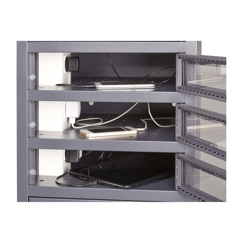 Každý tablet je uložen v individuálním oddělení vybaveném vlastní elektrickou zásuvkou, což umožňuje přímé napájení originálními adaptéry bez nutnosti centrálního nabíjecího modulu.