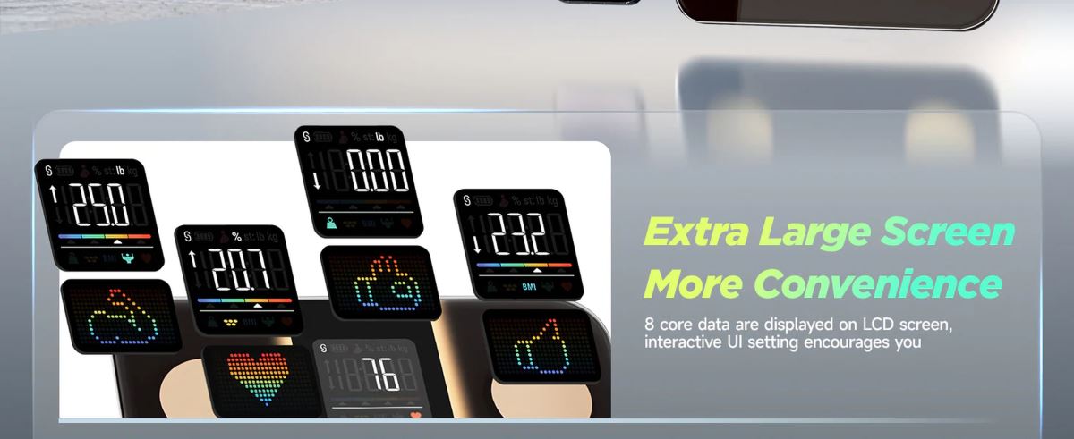 Na přehledném 8-in-1 VA LCD displeji se zobrazí osm klíčových ukazatelů – hmotnost, BMI, tělesný tuk, svalová hmota, srdeční frekvence, tělesný typ, motivační ikony a trendy. Díky tomu získáte okamžitý přehled i bez nutnosti otevírat aplikaci. Pro detailní analýzu je váha propojitelná s mobilní aplikací StarFit, která umožňuje sledovat výsledky v čase, porovnávat data a synchronizovat je s Apple Health, Fitbit či Google Health Connect.