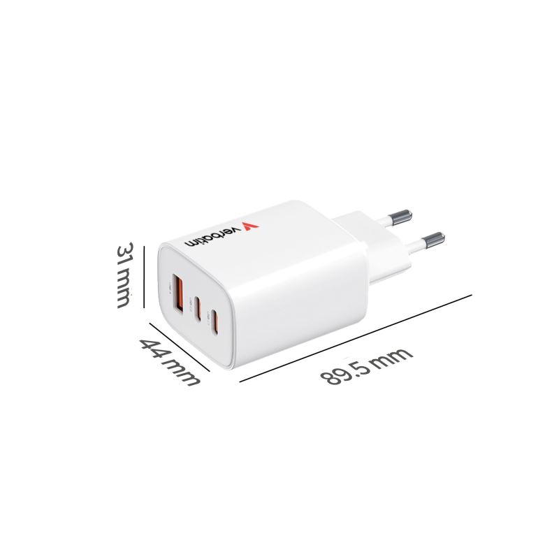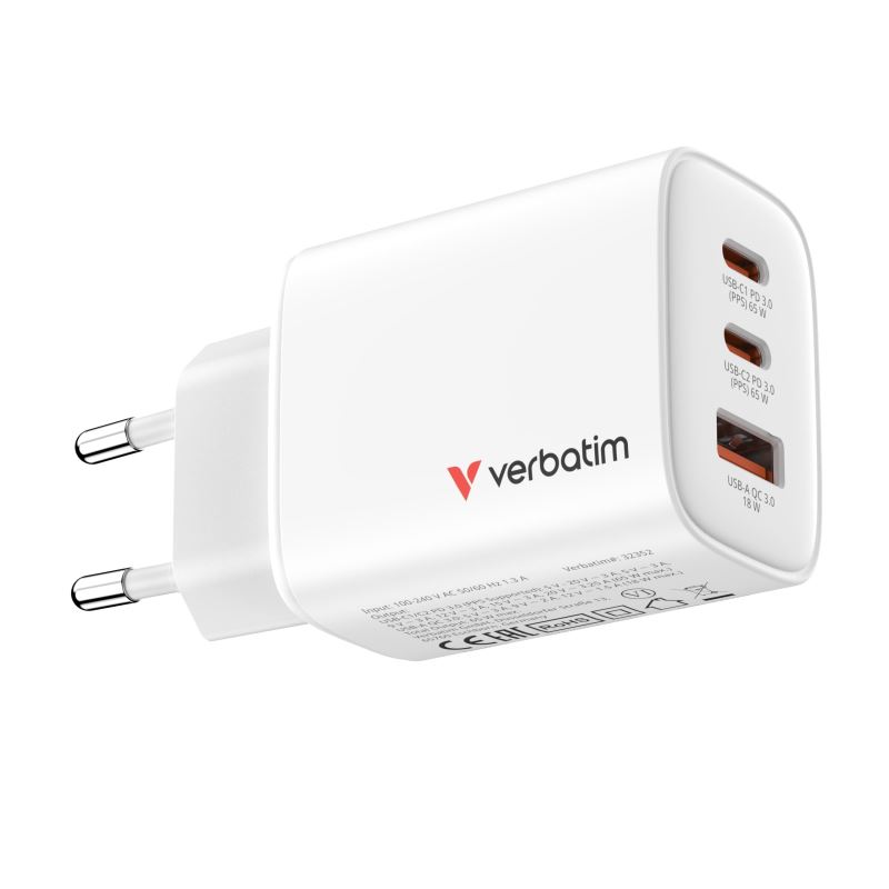 Verbatim GaN cestovní adaptér Essentials 65W, 2×USB-C PD, 1×USB-A QC, EU konektor, bílá