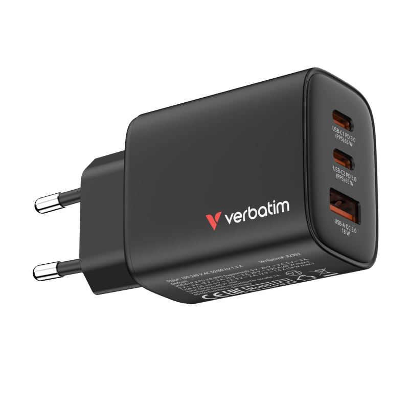 Verbatim GaN cestovní adaptér Essentials 65W, 2×USB-C PD, 1×USB-A QC, EU konektor, černá