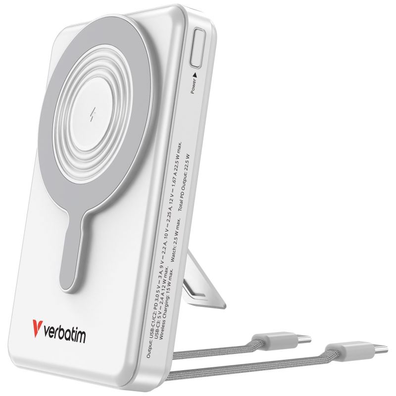 Prémiová powerbanka Verbatim s bezdrátovým magnetickým nabíjením, vestavěnými kabely a chytrým TFT displejem.
