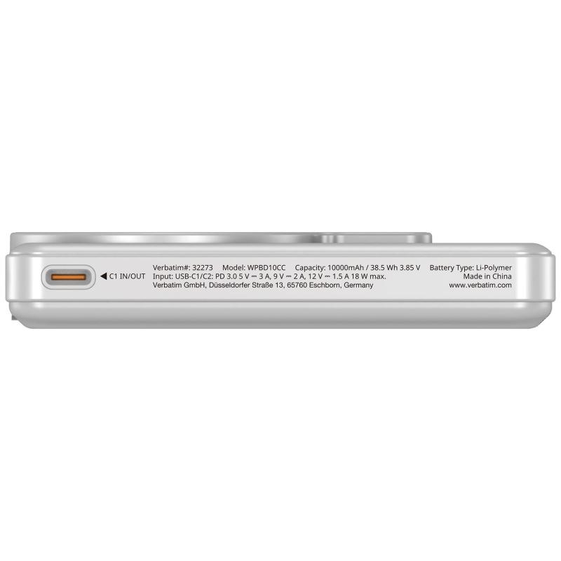 Verbatim magnetická bezdrátová powerbanka Charge 'n' Go C+C, displej, 10000 mAh, stříbrná