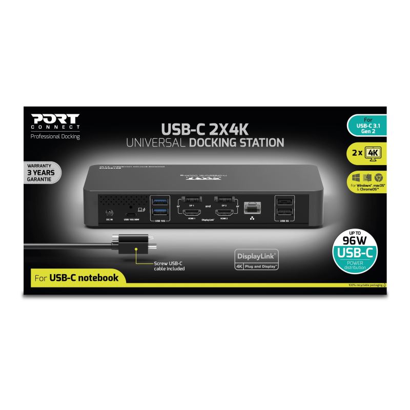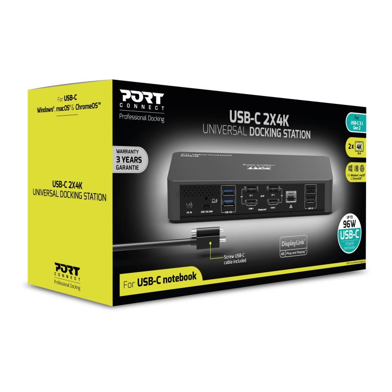 The docking station supports DisplayLink™ technology and is compatible with Windows®, macOS® and ChromeOS™, ensuring universal deployment in office and IT environments.