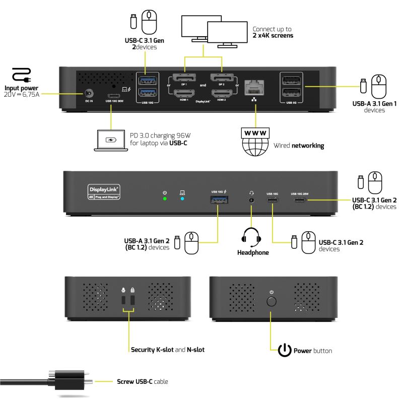 The docking station is equipped with a 1m USB-C cable with a screw mount for a solid and secure connection, an LED power indicator and an anti-theft security slot.